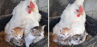 A Guy Photographed His Chicken Taking Care Of Three Orphaned Kittens