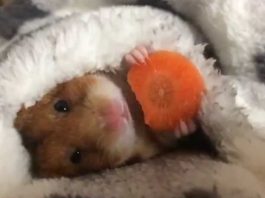Adorable Hamster Eating A Carrot In Bed, Wrapped In A Blanket