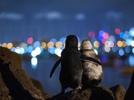 Two Penguins Overlooking The Melbourne Skyline Together While Comforting Eachother