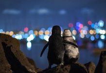 Two Penguins Overlooking The Melbourne Skyline Together While Comforting Eachother