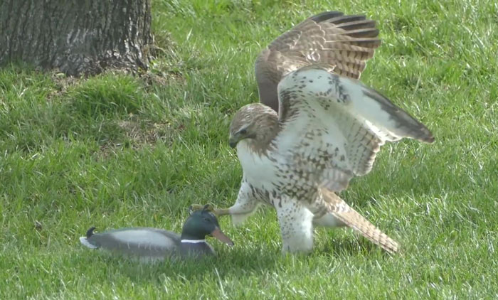 Firstly the hawk walks toward the duck at a fast pace and tries to grab the duck with its claws. After seeing no reaction, the hawk then goes around the duck, placing its claws everywhere on the duck’s body as if it were trying to wake the duck up from deep sleep. After the tireless efforts fail, the bird then decides to give up and leave in search of a more worthy opponent. The hawk will surely never forget this unique encounter ever in his life.