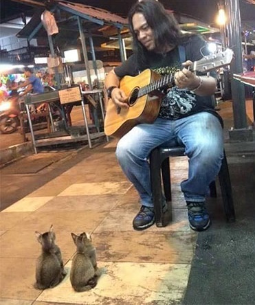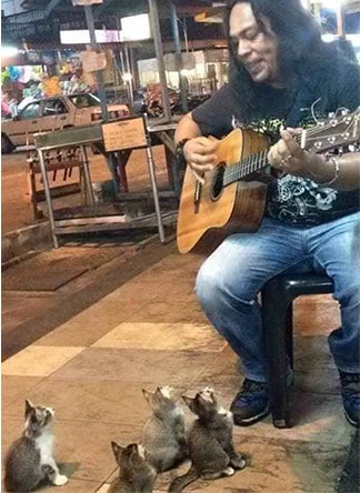 Since there weren’t many people interested in hearing this Malaysian busker sing, he was going to have to pack it in. The most adorable small crowd showed up as he began to sing for enjoyment… Four kittens, all three months old, showed up to provide their support!