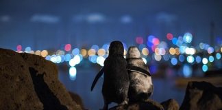 Two Penguins Overlooking The Melbourne Skyline Together While Comforting Eachother
